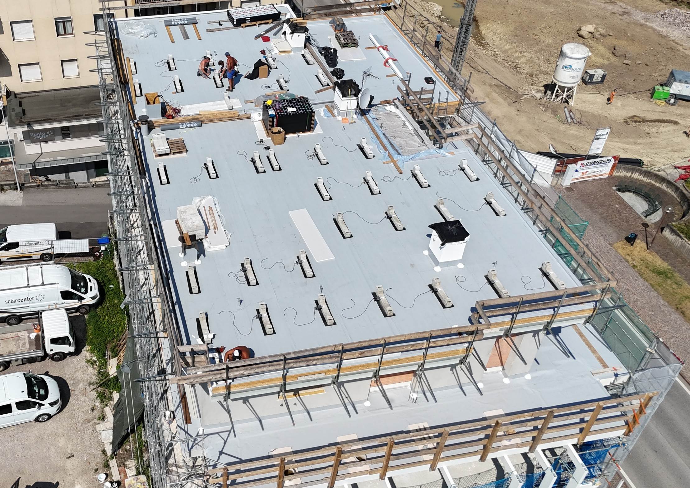 La realizzazione è avvenuta su tetto piano e pertanto il montaggio ha richiesto la posa di zavorre, blocchi di calcestruzzo che garantiscono un’installazione sicura dei moduli.